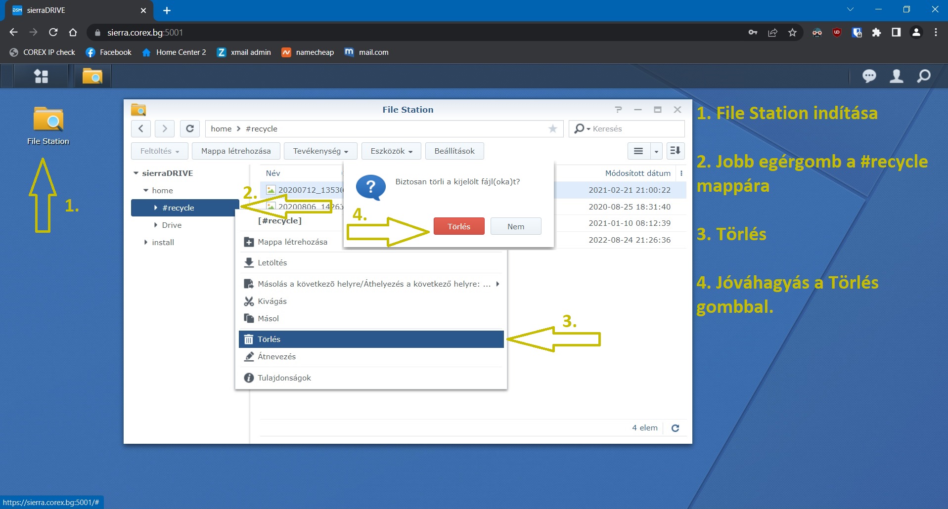 A Synology file szerverre belépve az alábbi 4 lépést követve tudjuk kiüríteni a Home mappánk lomtárát: